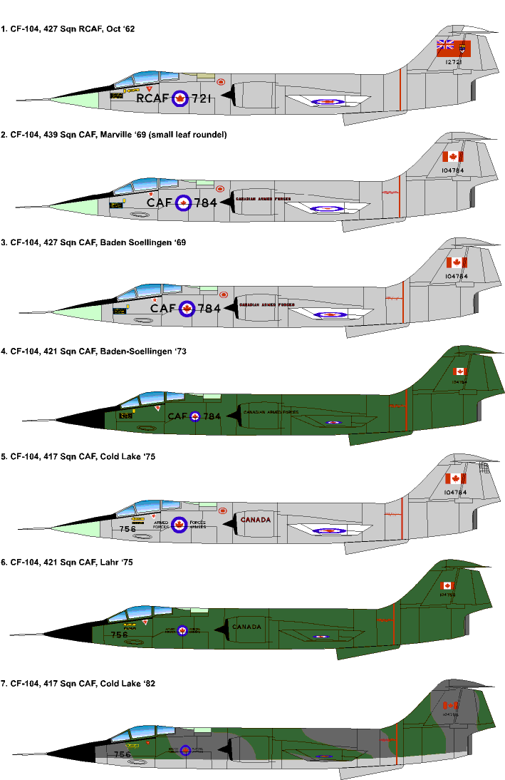 This sheet provides markings for ANY CF-104 Starfighter in Canadian service from initial delivery to the RCAF in 1962 until it went out of service in 1984. A generic sheet, it provides sufficient roundels, markings and numbers in the correct sizes so any operational CF-104 can be represented. Additional markings are provided so that any one of nine different Tiger Meet striped Starfighters can be represented from 1971 to 1983. Product review on ARC Product No. BD6 CF-104 Starfighters (1/72) This sheet provides the same markings as sheet BD6 above in 1/72 scale. Product review on ARC Product No. BD7