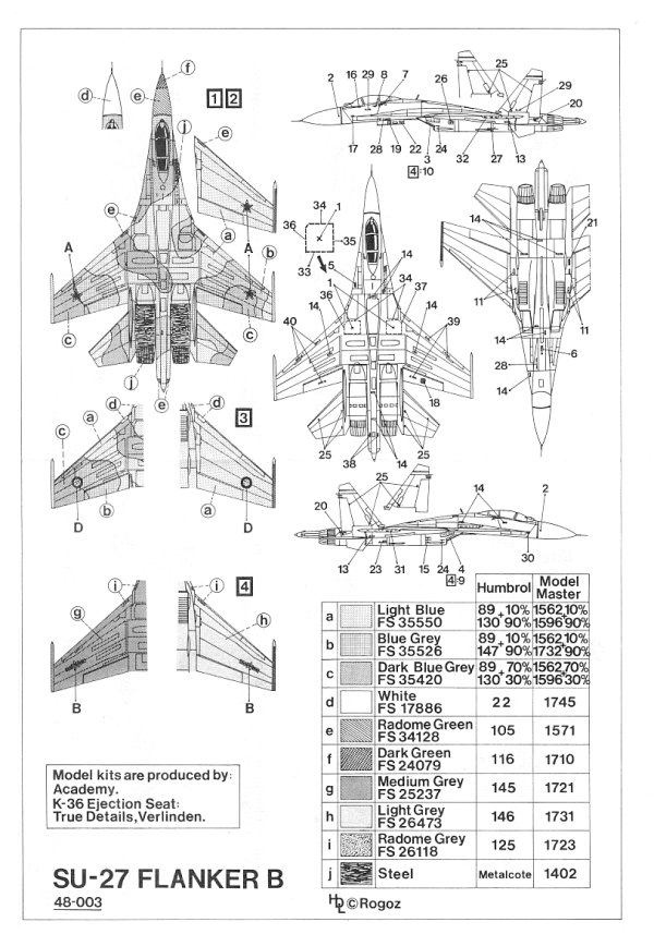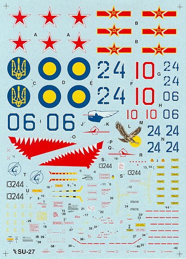 This decal sheet is for what many consider to be the sexiest looking jet ever made....the SU-27.  This particular decal sheet has full stencils for one plane and markings for 4 planes although one of the planes can be done in USSR markings prior to 1992 or Ukrainian markings to show it after 1992, so this would give you the option to built one of 5 different planes with this decal sheet.  There is Soviet/Russian Airforce Flanker based in Poland with "kill" marking stars denoting "only" live missle firings....which is interesting.  One version is for a USSR version with Sharks mouth on both sides of the plane.  Plus a Chinese SU-27....see below....