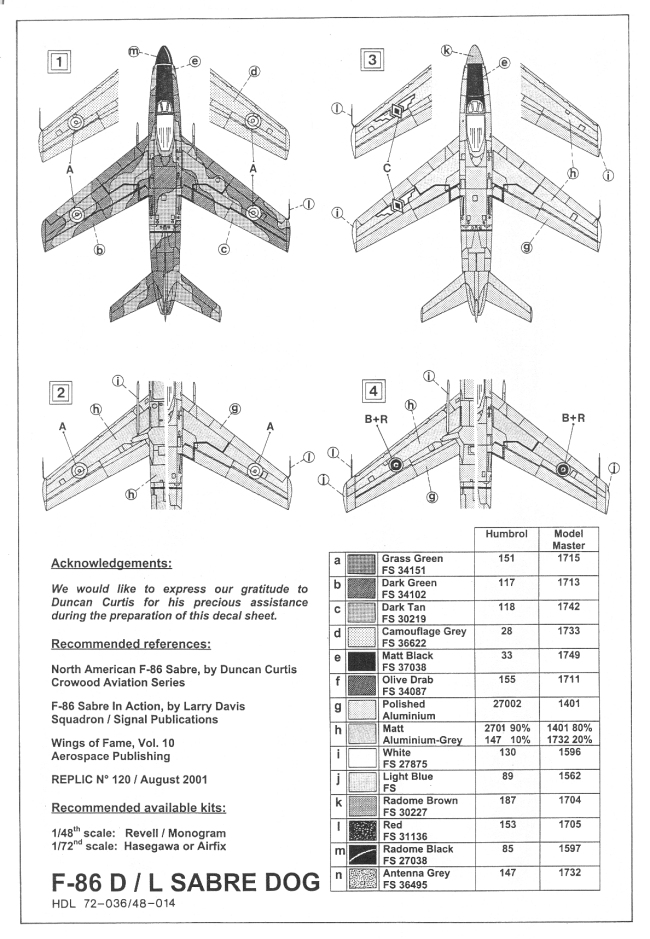 This decal sheet comes in 1/72 and 1/48 scale. It will permit you to build one of 4 different F-86D/L's. The 4 decal options include 2 from the Greek Air Force and one from the Phillippine Air Force and one from the Royal Thai Air force. The printing quality of the decal is first rate and very clear and in register.
