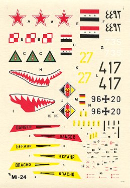 This decal sheet comes in 1/72 scale. The decal sheet includes stencils as well as marking for 5 different Mi-24's. This decal sheet covers the Mi-24 Hind from 5 different airforces including Polish, Soviet, German, Iraqi (Desert Storm), and East German. The painting options include everything from a 2 tone grey green upper surface with a shark mouth of the Polish Hind on this sheet to the dark green and Brown/Yellow of the Iraqi Hind on this sheet. The quality of the sheet is good....excellent colours.....clear printing and completely in register although the stencil data for the 1/72 stencils are too small to be clearly printed and readable. I recommend this sheet to anyone looking for interesting options to the kit decals.