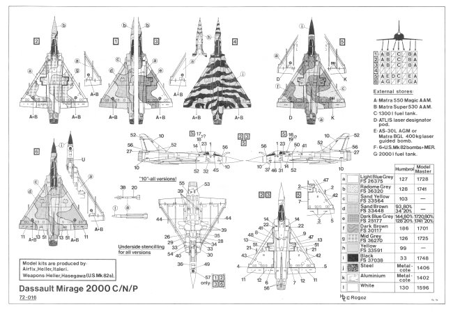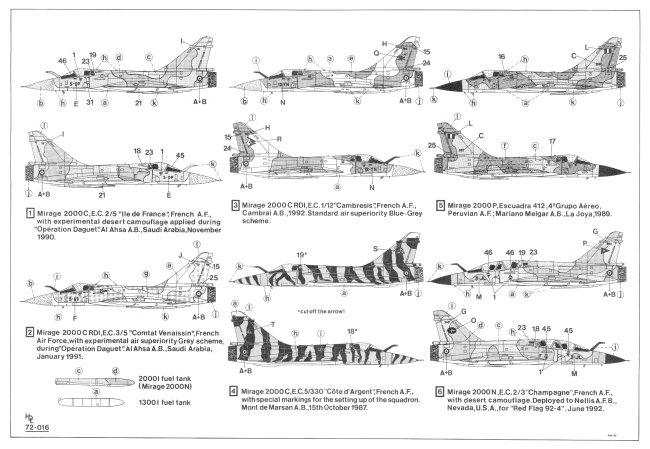 Decal option #1 is for a Mirage 2000C, E.C. 2/5 "lle de France", French Air Force with experimental desert camouflage applied during "Operation Daguet". Al Ahsa Airbase in Saudi Arabia in November 1990. The paint scheme is Sand Yellow FS 33564 and Sand Brown FS 33448 and the underside is painted camouflage Light Blue Grey FS 26375. The nose is painted Randome Grey FS 36320.