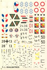 This decal sheet comes in 1/72 scale. The decal sheet includes stencils for one of six L-39 Albatros. This decal sheet covers an Iraqi L-39 during Operation Desert Storm to a German L-39 to a Chech and Slovak "Tiger Meet" L-39 as well as a Egyptian L-39 and an Lithuanian L-39. The painting options include everything from a 3 colour Olive Green and Sand Iraqi Desert Scheme from Desert Storm on this sheet to a Dark Green and Ochre paint scheme of the German L-39. The quality of the sheet is good....excellent colours.....clear printing and completely in register although the stencil data for the 1/72 stencils are too small to be clearly printed and readable. I recommend this sheet to anyone looking for interesting options to the kit decals. Recommended kits are the 1/72 KP kit.
