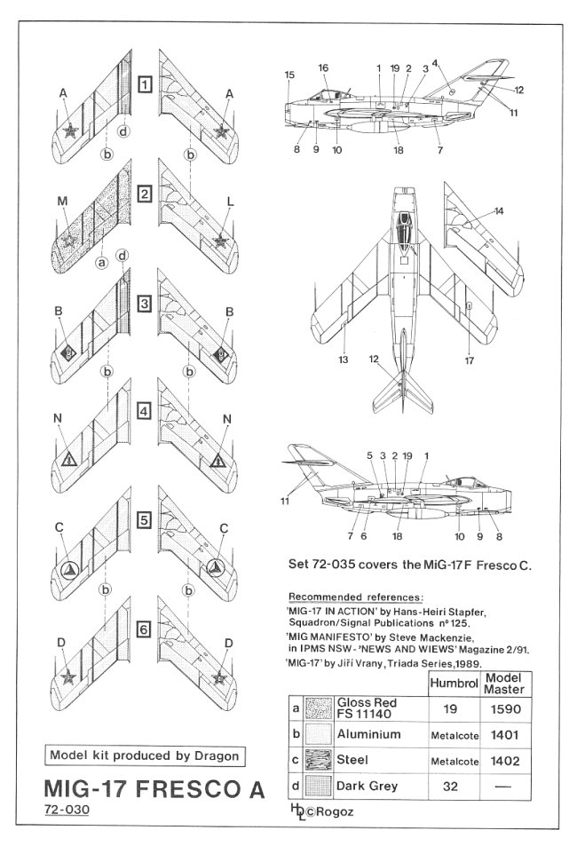 The second decal options is for a MiG-17 Fresco A of the Soviet Air Force Aerobatic Team in 1956. The paint scheme of this plane is Gloss Red (FS 11140) on the top surfaces and Aluminium on the underside.....with some steel on the rear fuselage sides by the engine exhaust.