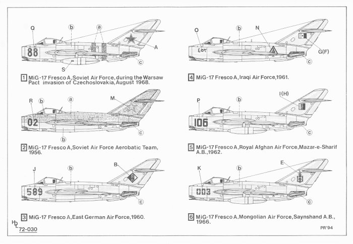 The first decal option is for a MiG-17 Fresco A of the Soviet Air Force during the Warsaw pact invasion of Czechoslavakia in August 1968. The paint scheme of this plane is Aluminium on top and bottom.....with some steel on the rear fuselage sides by the engine exhaust. There are Gloss Red (FS 11140) fuselage bands around the rear part of the fuselage.