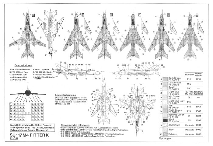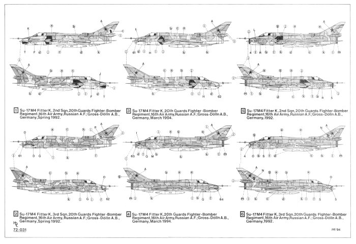 The sixth decal option is for a Su-17M4 Fitter K of the 3rd Squadron, 20th Guards Fighter Bomber Regiment, 16th Air Army of the Russian Air Force at Gross-Dolin AB, Germany in Spring 1992. This plane is Dark Green (FS 34079) and Dark Brown (FS 30108) and Mid Green (FS 34226) on top and Light Blue Grey (FS 34277) on the underside.