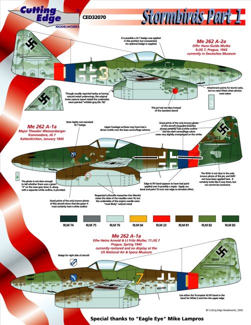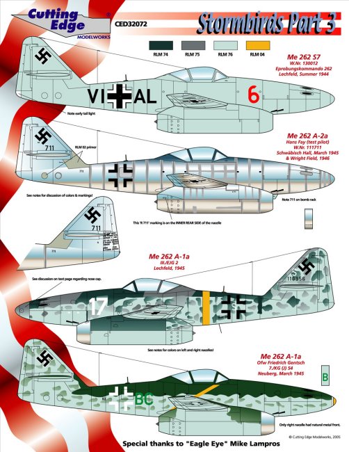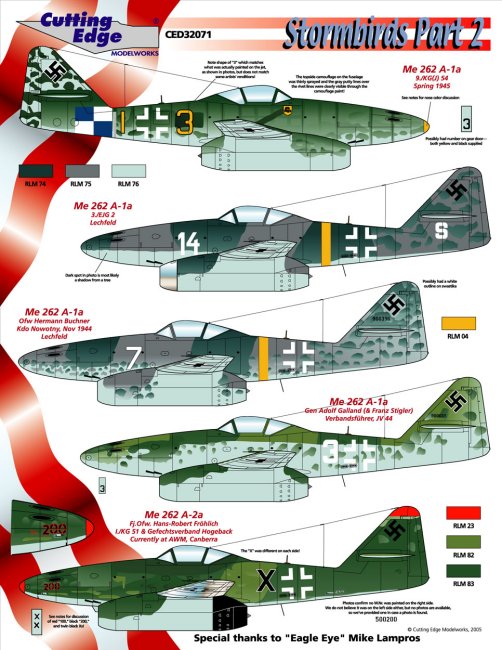 CED32071 Me 262 A-1a, Yellow 3, 9./KG(J) 54, Spring 1945; Me 262 A-1a, White 14, 3./EJG 2, Lechfeld; Me 262 A-1a, White 7, Ofw Hermann Buchner, Kdo Nowotny, Nov 1944, Lechfeld; Me 262 A-1a, White 3, Gen Adolf Galland (& Franz Stigler), Verbandsführer, JV 44; Me 262 A-2a, Black X, Fj.Ofw. Hans-Robert Fröhlich, I./KG 51 & Gefechtsverband Hogeback, Currently at AWM, Canberra. $12.99 |