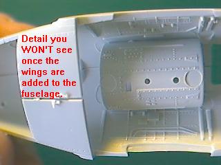 Erik Houghton, these areas were visible from below through the main gear bays of the real aircraft. Unfortunately, the main gear bays on the model are not open to the inner fuselage. To remedy this, you'll need to cut open the inside of the main gear wells, but first make sure you have good reference photos so you know exactly where to cut, and how and what to do to mount the gear legs.