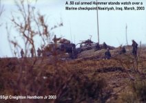 From the get go our mission was going to be to take the bridges in Nasiriyah to clear the route north for the 1st Marine Expeditionary Force (MEF) from California. On March 20th we left our base camp in Kuwait and headed north to our assembly area. That night 1 MEF crossed the breach into Iraq and we followed the next morning. We headed north to Jalibah Airfield and on the night of the 22nd we set into a defensive position north of the airfield. Early in the morning of the 23rd we packed up and headed for Nasiriyah.