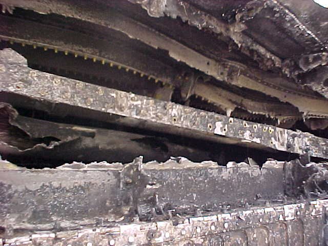 The point of entry pics show where a projectile entered Tank 1A, which was full of fuel, and, after it ignited, proceeded to burn away at the spar. The fuel tank ribs in the area directly in front of the O/B flap are burnt almost 50% through.